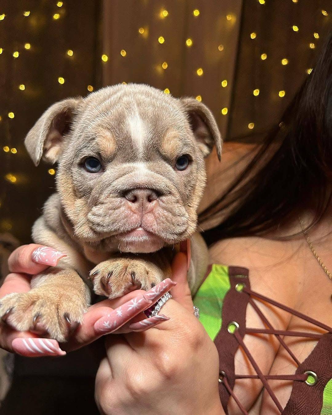 Description: Meet Bella, an exquisite 8-week-old lilac tan merle English Bulldog puppy with one of the most sought-after color combinations in the breed. Her plush coat features a soft lilac base with beautiful merle patterning and warm tan points on her face, legs, and chest, creating a stunning marbled effect. She has those signature deep bulldog wrinkles, a perfect rope nose, and striking bright blue eyes that give her the sweetest, most captivating expression.