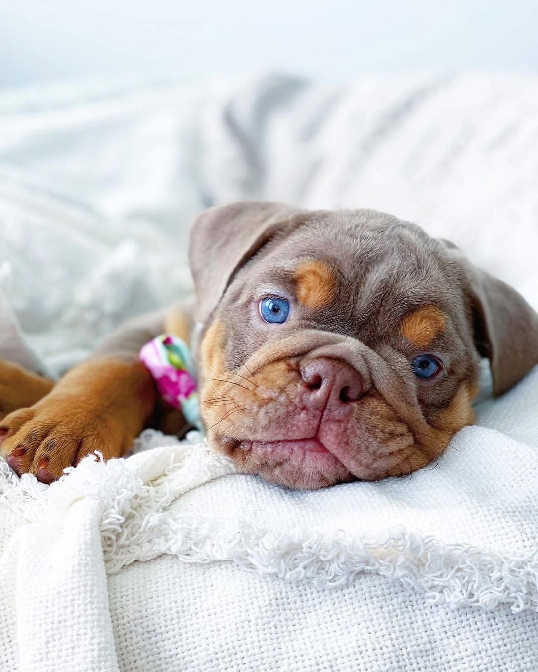 Description: This gorgeous girl is Daisy, an 8-week-old lilac tan English Bulldog puppy with an absolutely stunning rare color. Her soft, plush coat is a beautiful lilac (dilute chocolate) shade with rich tan points on her face, eyebrows, chest, and legs, giving her that classic yet exotic look. She has the perfect bulldog features — deep wrinkles, a strong rope over her nose, stocky build, and those mesmerizing bright blue eyes that make her face completely unforgettable.