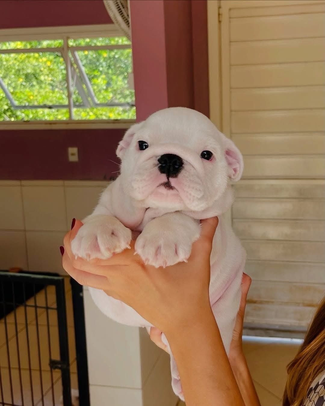 Description: This adorable little girl is Lily, an 8-week-old all-white English Bulldog puppy with a beautifully clean, snow-white coat and the classic bulldog features we all love — lots of soft wrinkles, a perfect pushed-in nose, and big, round dark eyes that give her the sweetest, most innocent expression. Her compact, chunky build and tiny rolled tail make her the ultimate pocket-sized bulldog dream.